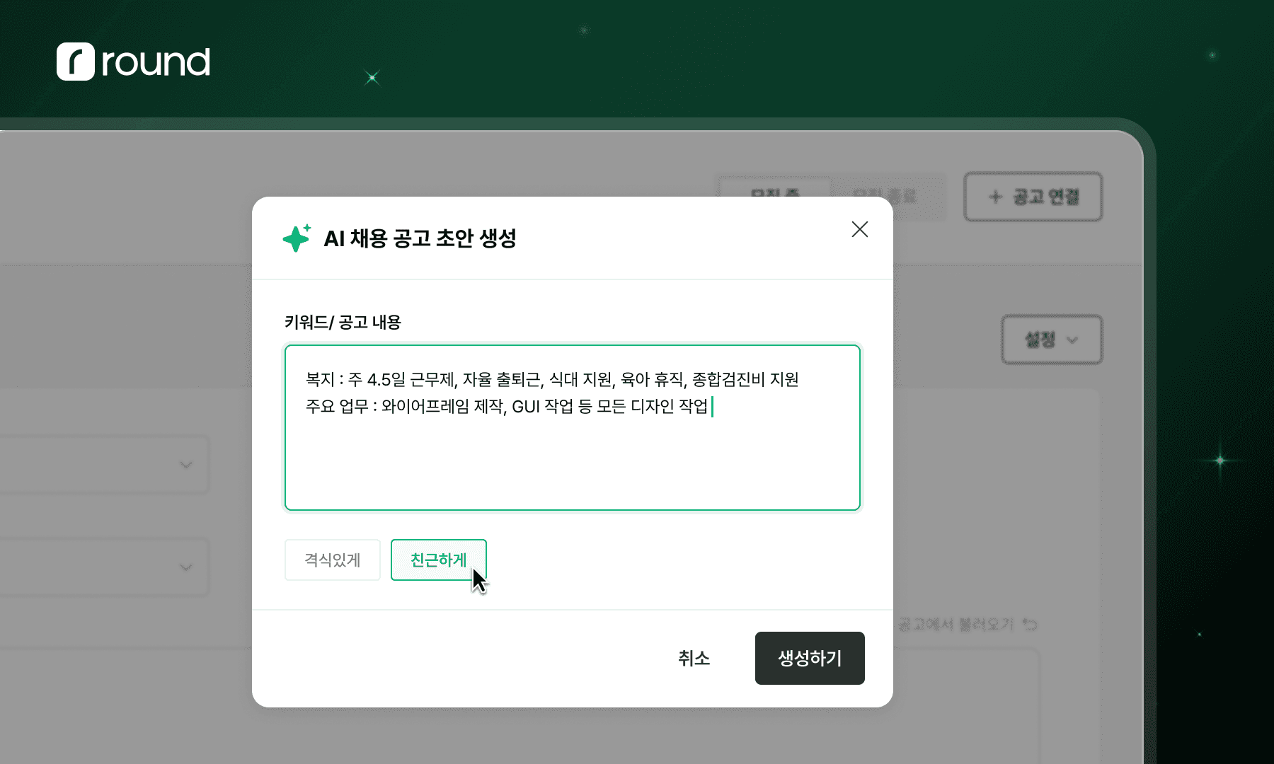 ⁕ 채용 솔루션으로 하는 법 (Feat. 라운드HR 활용) ▢ '직군명', '부서명'만 기입하면 직군별 공고 템플릿이 뚝딱 생성됩니다! ▢ 직군별로 채용 프로세스를 다르게 세팅할 수 있어요! Ex. 코딩 테스트, 과제 제출 ▢ 기업 소개, 복리 후생 등 공통 문구는 한 번만 써두고 자동 불러오기 하세요! ❗'AI 초안 생성' 기능을 쓰면 키워드만으로 채용 공고 초안이 자동 생성됩니다. ❗'AI 초안 생성' 시, '격식있게' 또는 '친근하게'로 톤앤매너를 선택할 수 있어요.