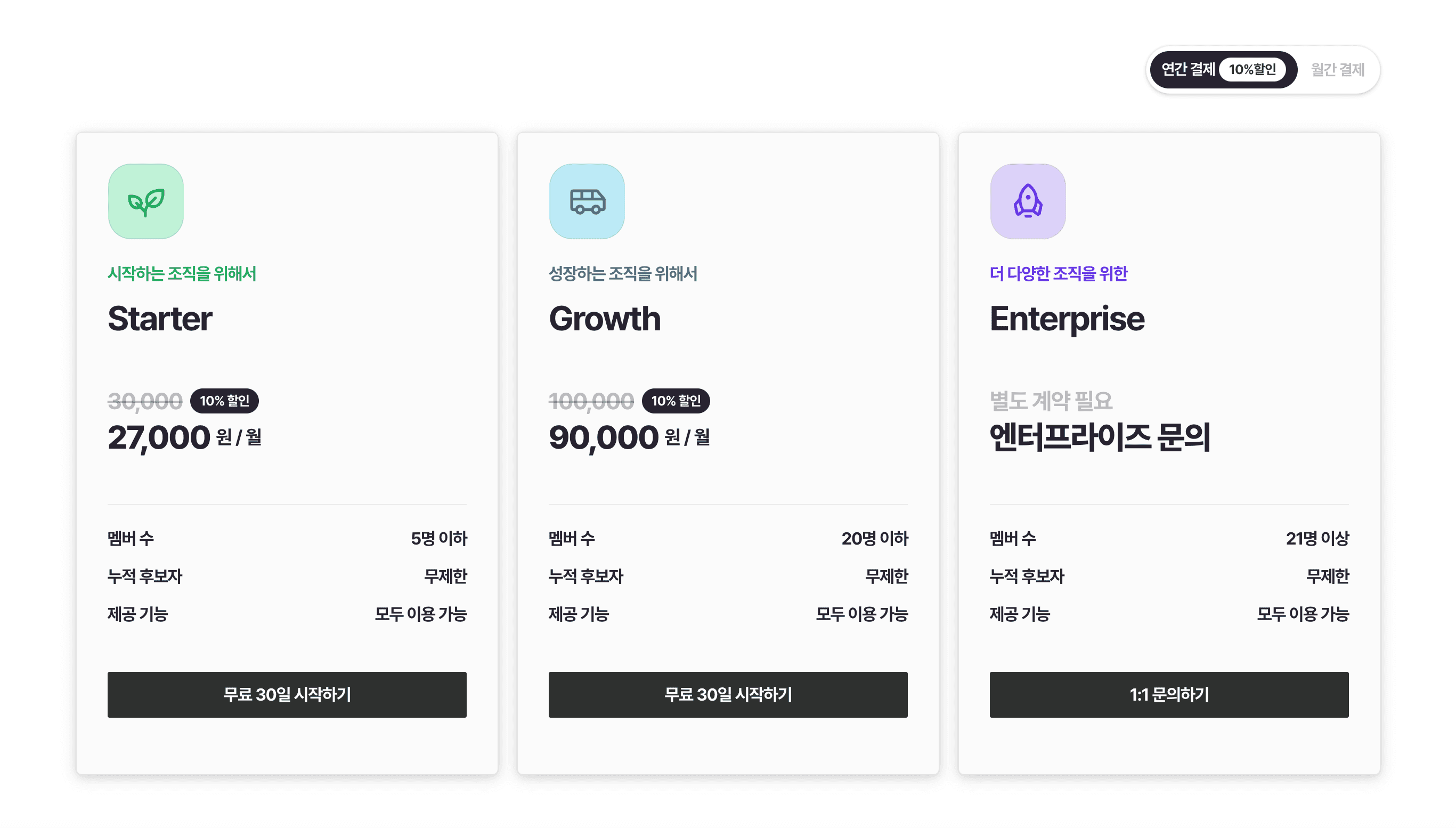 기존의 다양한 ATS 솔루션은 저가 요금제의 경우 제한된 기능만을 제공하여 상위 요금제로 업그레이드해야만 추가 기능을 사용할 수 있었습니다. 라운드HR의 가장 큰 장점은 요금제에 상관없이 모든 기능을 사용할 수 있다는 것입니다. 기능 사용에 있어 요금제 구분이 없고, 단지 사용하는 멤버 수에 따라 요금제가 달라져요.