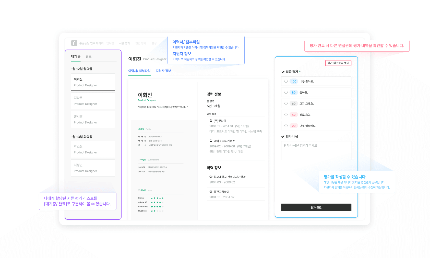기업의 모든 채용 과정을 한눈에 확인하고 각 전형 단계에서 지원자를 실시간으로 추적할 수 있습니다. 지원자 상태 변화, 서류 검토, 면접 일정 관리 등 모든 과정을 클릭 몇 번으로 해결할 수 있으며, 체계적인 평가 프로세스를 구축하여 객관적이고 공정한 평가가 가능합니다.