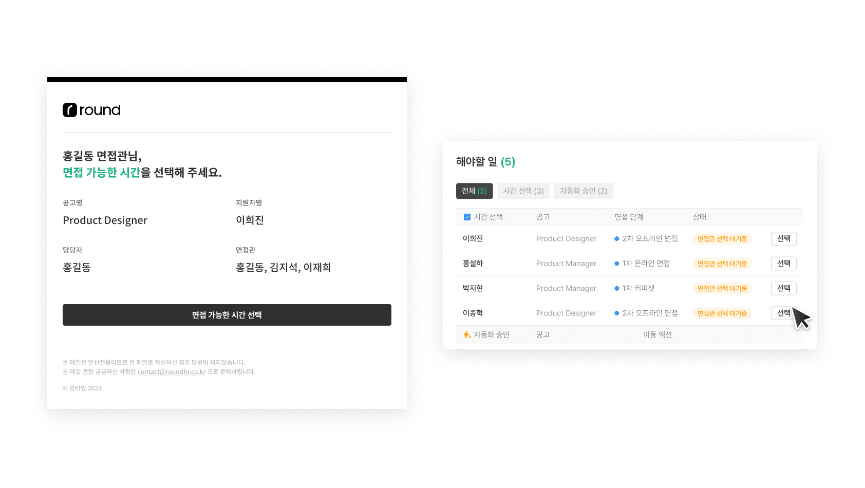 라운드HR의 모든 기능을 활용해 채용 프로세스를 최적화하고, 우리 회사에 딱 맞는 지원자를 채용할 수 있도록 곁에서 도와드릴게요.