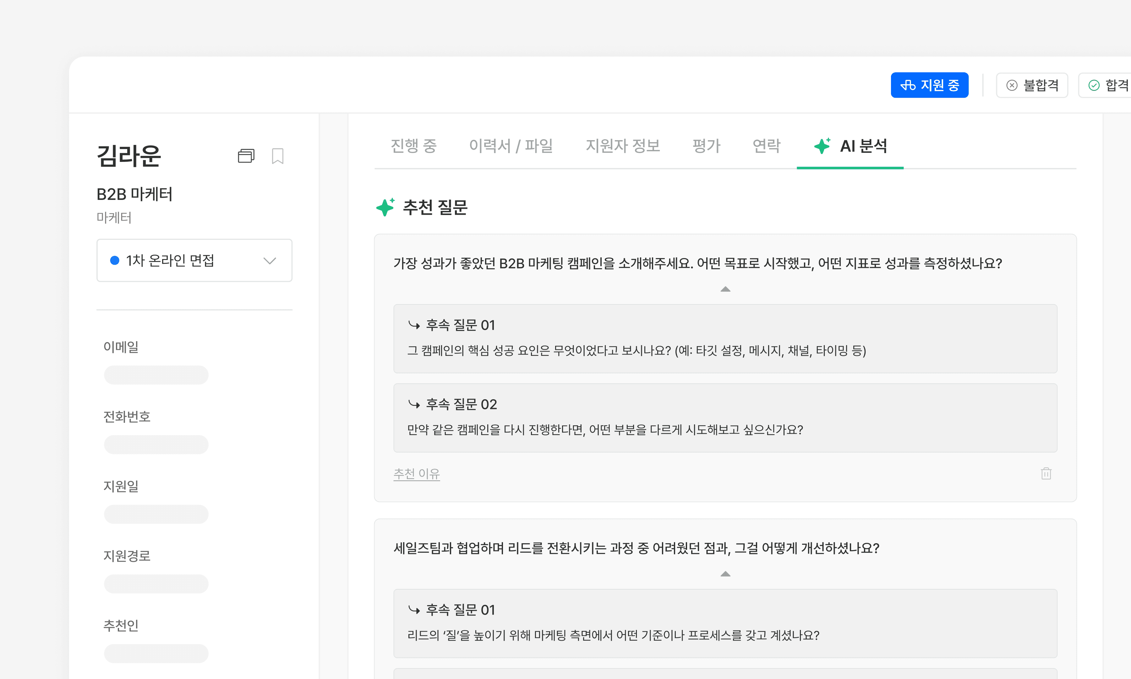 구조화된 면접 질문을 촘촘히 설계하고, 면접관들도 교육 받은 대로 공정하게 면접을 진행했지만, 지원자의 답변이 부실할 수 있습니다. 이때 지원자의 능력과 경력을 확실히 확인하기 위해 좀 더 예리한 추가 질문이 필요한데요. 라운드HR이 제공하는 채용 전용 AI, ‘라운드AI’는 JD와 이력서를 분석해 행동면접기반의 맞춤형 면접 질문과 후속 질문을 제안합니다. 지원자가 이력서에 기재한 내용을 면밀히 검증하기 위한 추천 질문을 제안하는 것인데요. 구조화된 면접 템플릿을 활용하되, 현장에서 지원자의 답변이 불충분하거나 두루뭉술하다면 라운드AI의 추천 및 후속 질문을 참고하여 지원자의 역량을 검증할 수 있습니다.