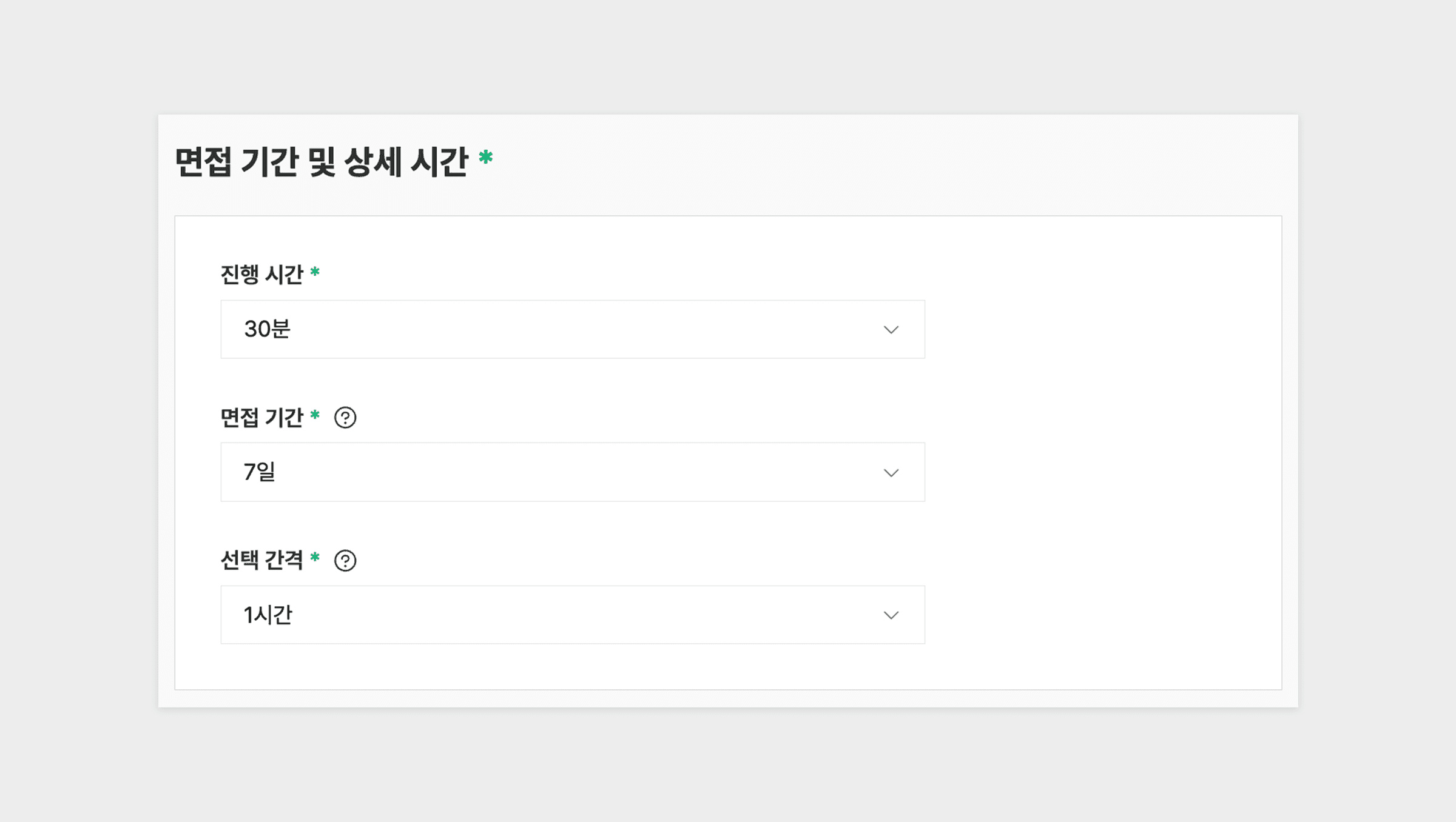 1차 인터뷰, 2차 인터뷰, 공통 인터뷰 등 각 템플릿에 알맞은 면접 기간과 상세 시간을 설정하세요. 1차 인터뷰 템플릿이라면 진행 시간은 1시간 내외, 면접 기간은 7~10일, 선택 간격은 30분 전후를 추천합니다. 면접 기간은 주말과 공휴일을 제외한 영업일 기준으로 설정할 수 있고, 선택 간격은 예를 들어 15분으로 선택하면 0분, 15분, 30분, 45분 간격으로 면접 일정을 잡을 수 있습니다.