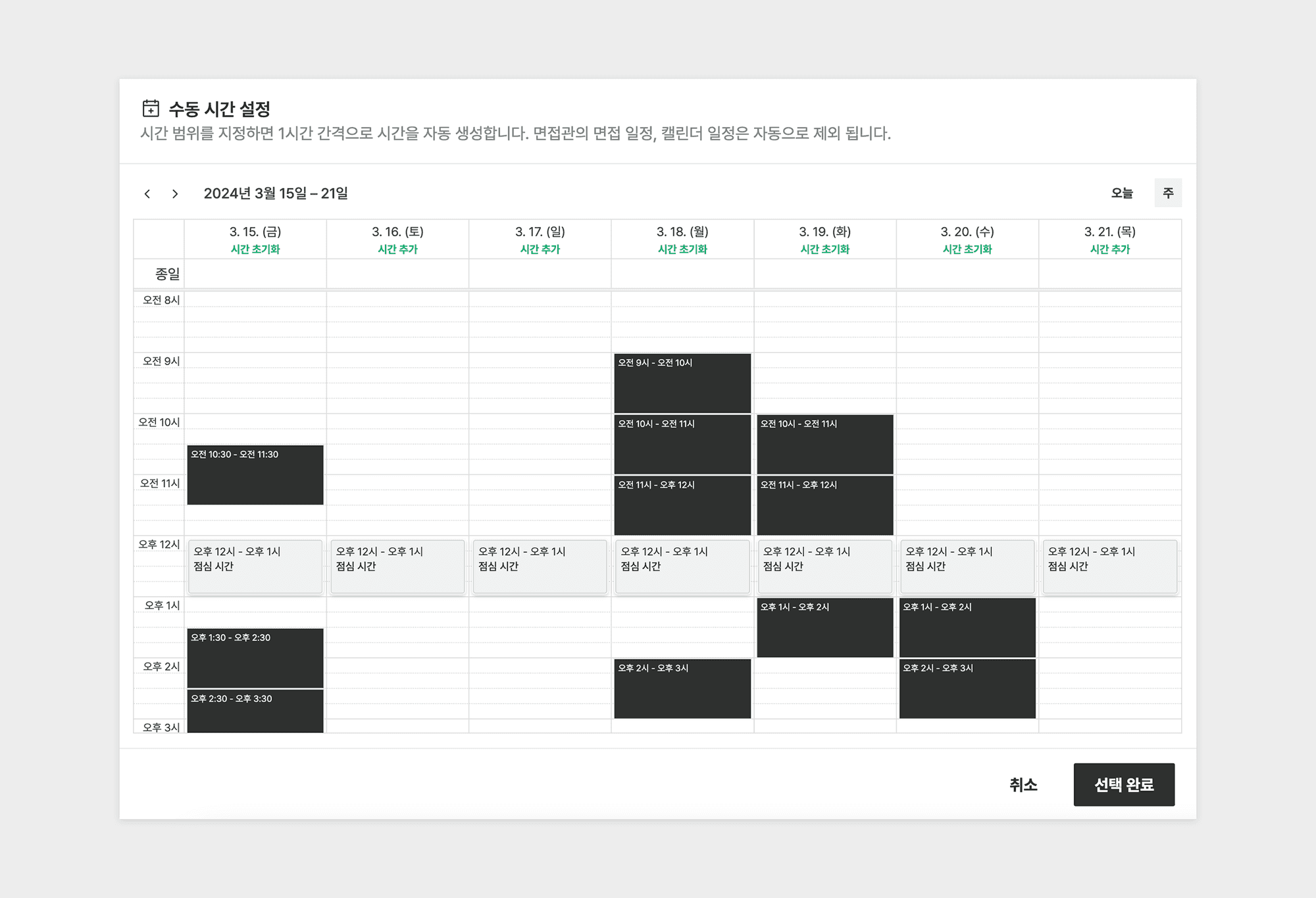후보자에게 면접 요청을 할 때 특정 일자 및 시간을 수동으로 선택하여 전달합니다. 일자 아래 있는 ‘시간 추가’를 선택하면 하루의 모든 시간이 선택되고, 시간 범위를 직접 지정하면 1시간 간격으로 시간을 자동 생성할 수 있어요. 이때 면접관의 면접 일정과 캘린더 일정은 자동으로 제외되기 때문에 만약 일정이 있는 시간을 선택하여 후보자에게 전달해도, 면접관의 캘린더를 반영하여 면접관이 가능한 시간만 후보자에게 보입니다.