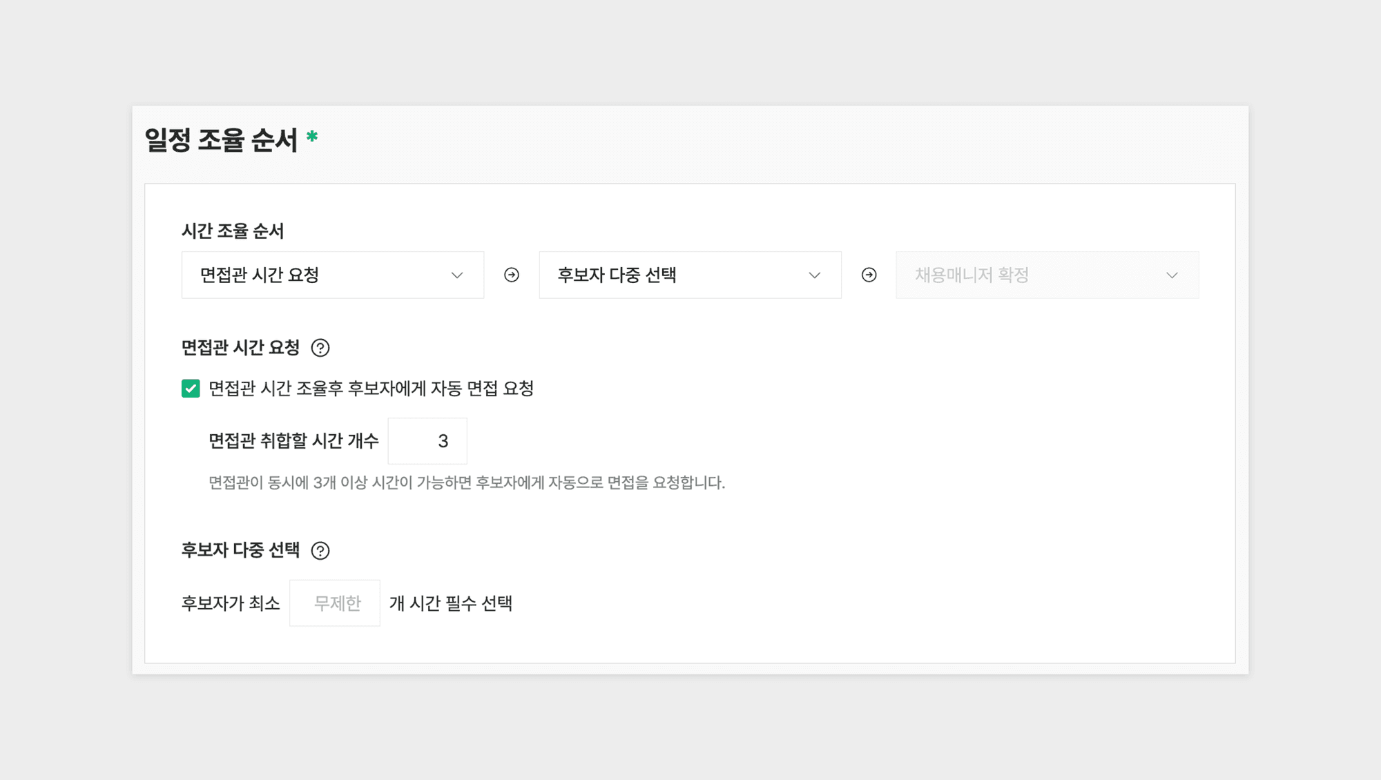 (2) 후보자 다중 선택 후보자가 선택한 시간 중 하나를 채용매니저가 확정합니다. 후보자 다중 선택을 활용하면 후보자가 최소 1개부터 무제한으로 시간을 선택할 수 있어요.