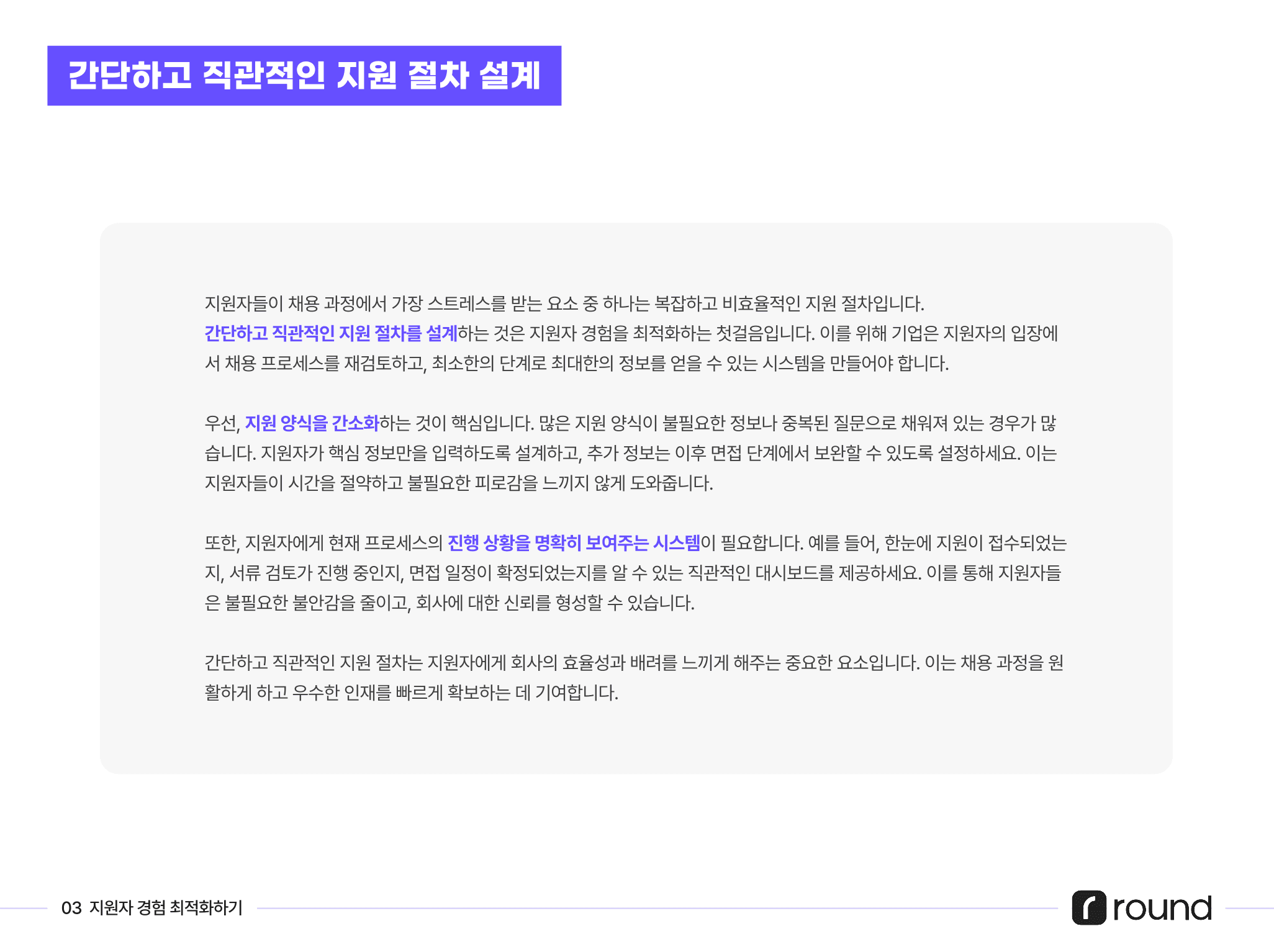 간단하고 직관적인 지원 절차는 지원자에게 회사의 효율성과 배려를 느끼게 해주는 중요한 요소입니다. 이는 채용 과정을 원활하게 하고 우수한 인재를 빠르게 확보하는 데 기여합니다.