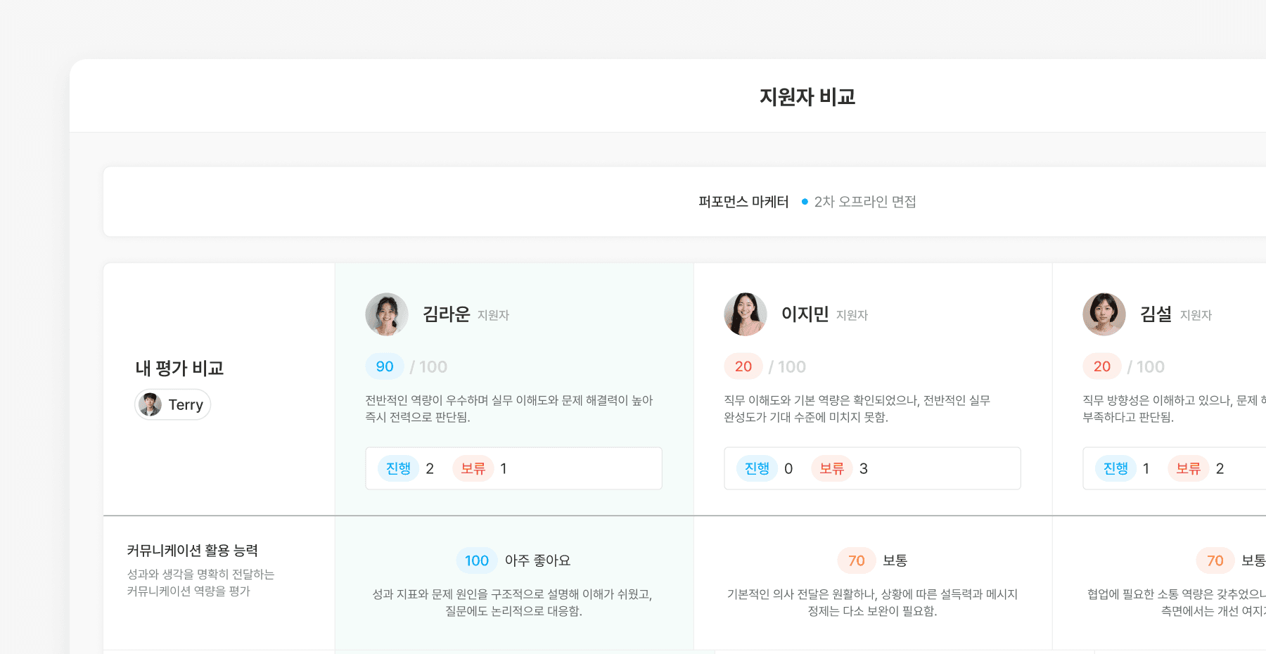 모든 평가자의 점수와 코멘트를 한눈에 볼 수 있고, 지원자들을 나란히 놓고 비교할 수 있는 기능입니다. 2026.01.08